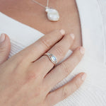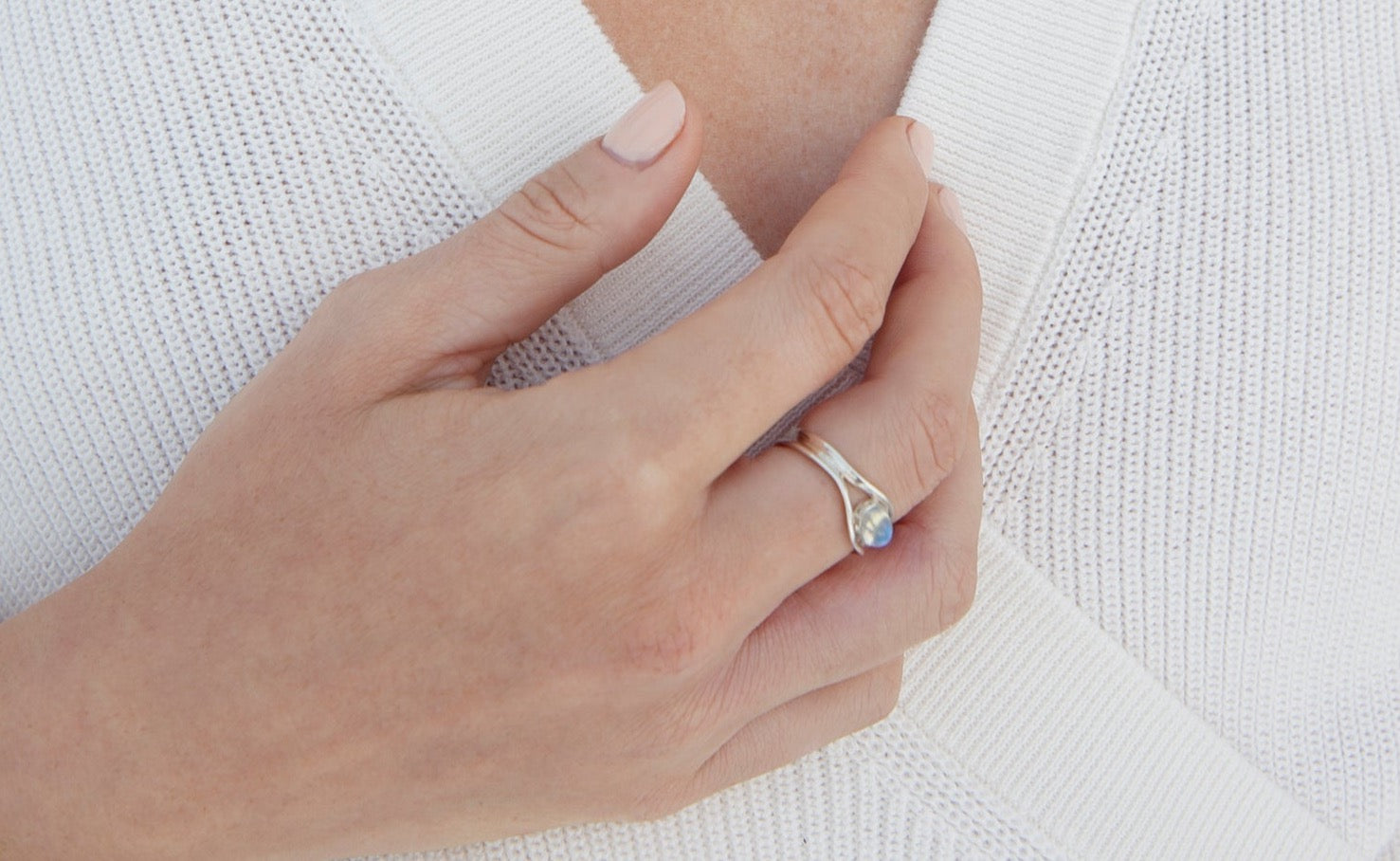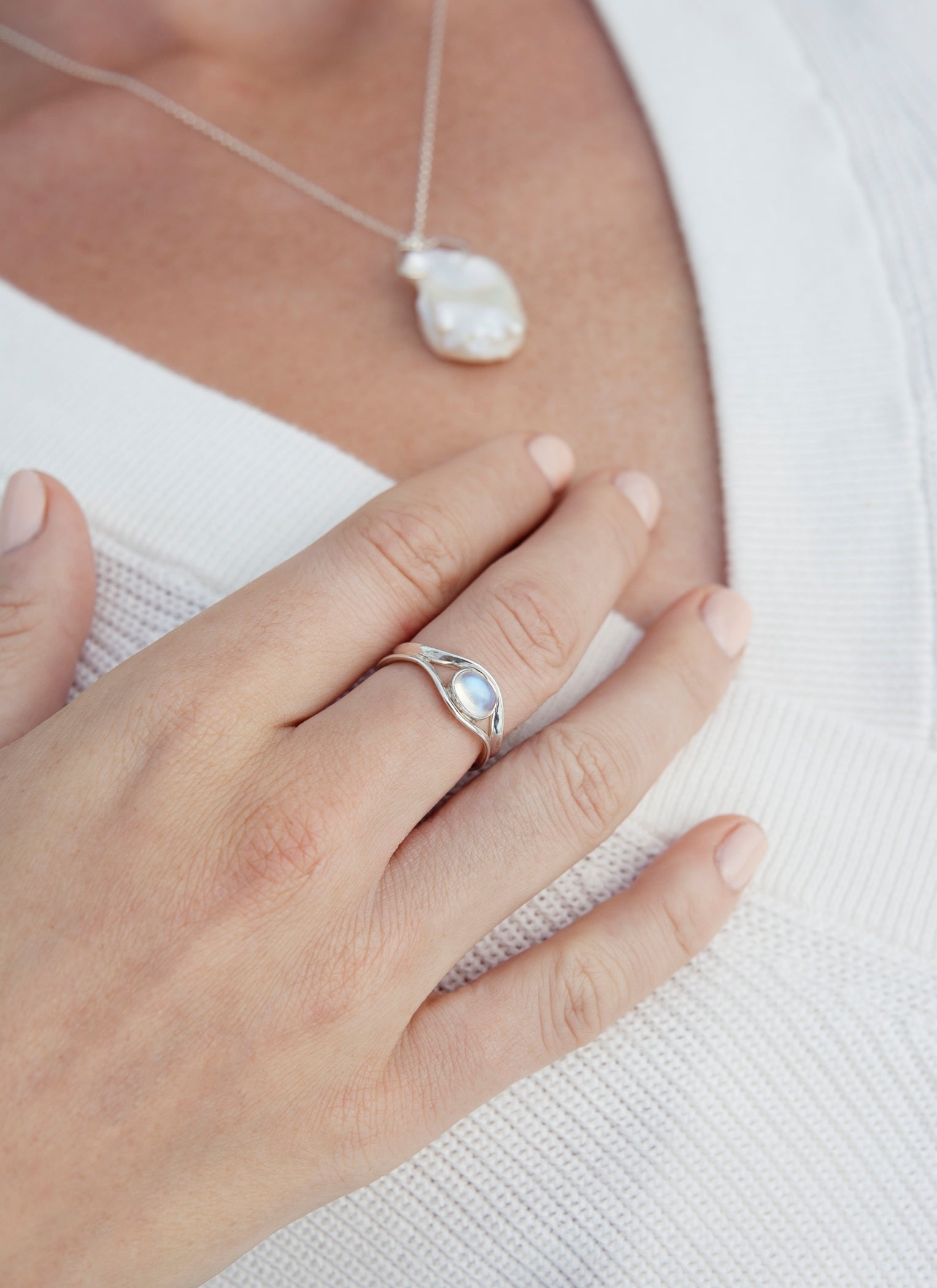 - Ring is set with ethically sourced blue sheen Moonstone.