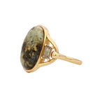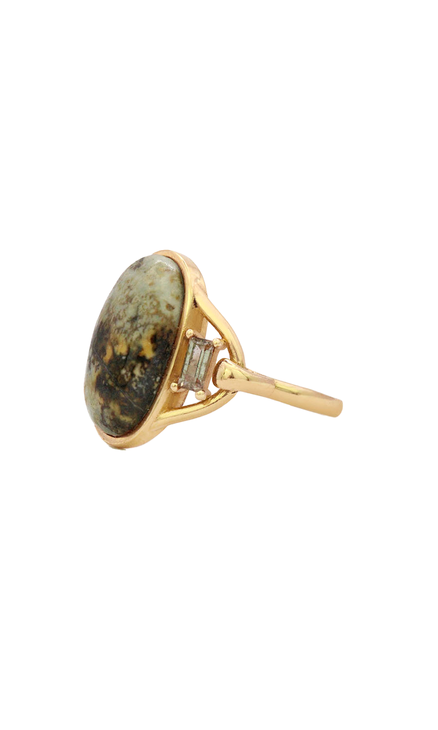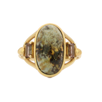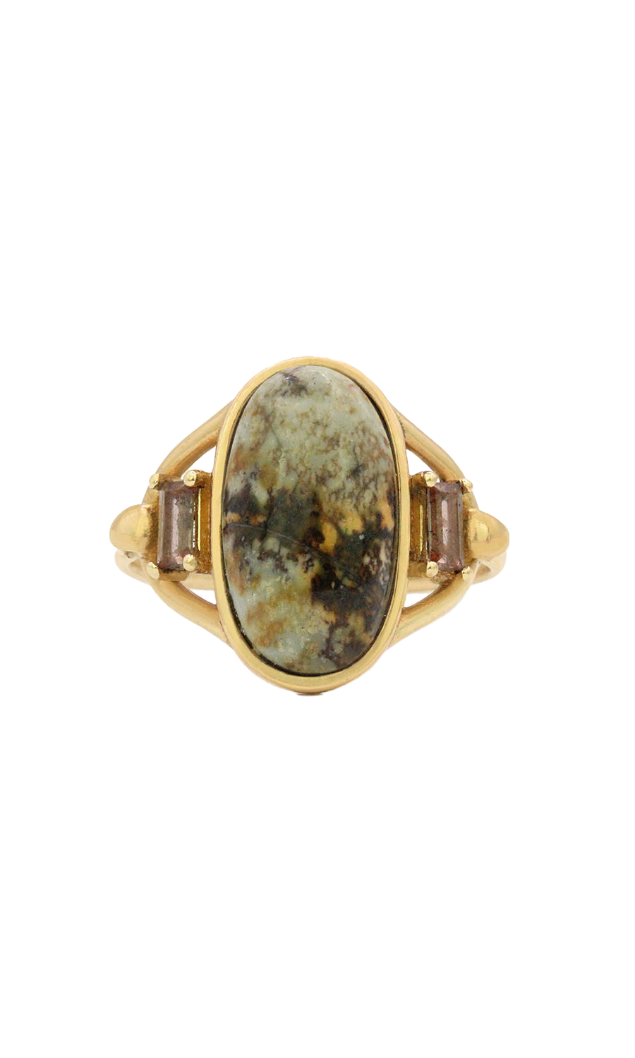 One of a kind, Jasper from AZ, accompanied by two baguette cut grossular garnets from Iowa set in 18kt yellow gold ring. The ring shank design is inspired by traditional horse and bit motifs that was popularized in jewelry in the victorian era.