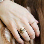 This ring was hand fabricated in a 3rd generation family owned workshop in NYC, and is made of a recycled gold alloy.