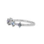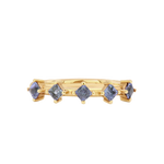 A sweet five-stone band, featuring princess cut tanzanites. Intended to be worn as subtle statement or an addition to your stack (and styled with) your daily jewelry repertoire.