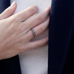 A sweet five-stone band, featuring princess cut tanzanites. Intended to be worn as subtle statement or an addition to your stack (and styled with) your daily jewelry repertoire.