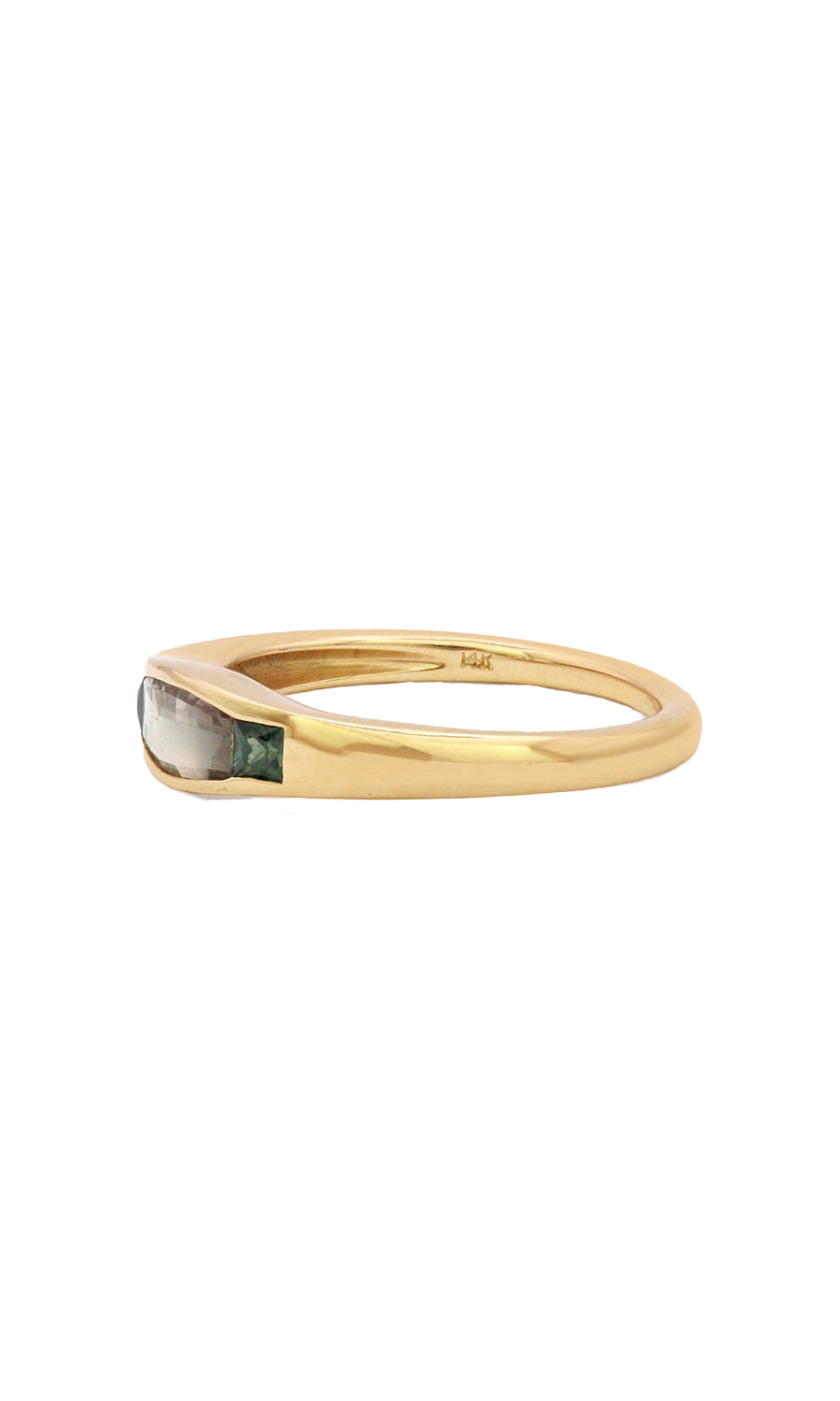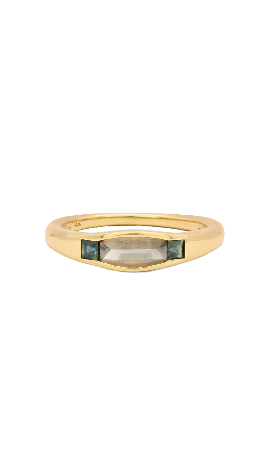 The Solstice Canyon Ring's gold curves, incase three stones (cross bar cut Oregon sunstone, and two Australian sapphires), gleaming between ridges of gold, like the sun rising through the canyon.