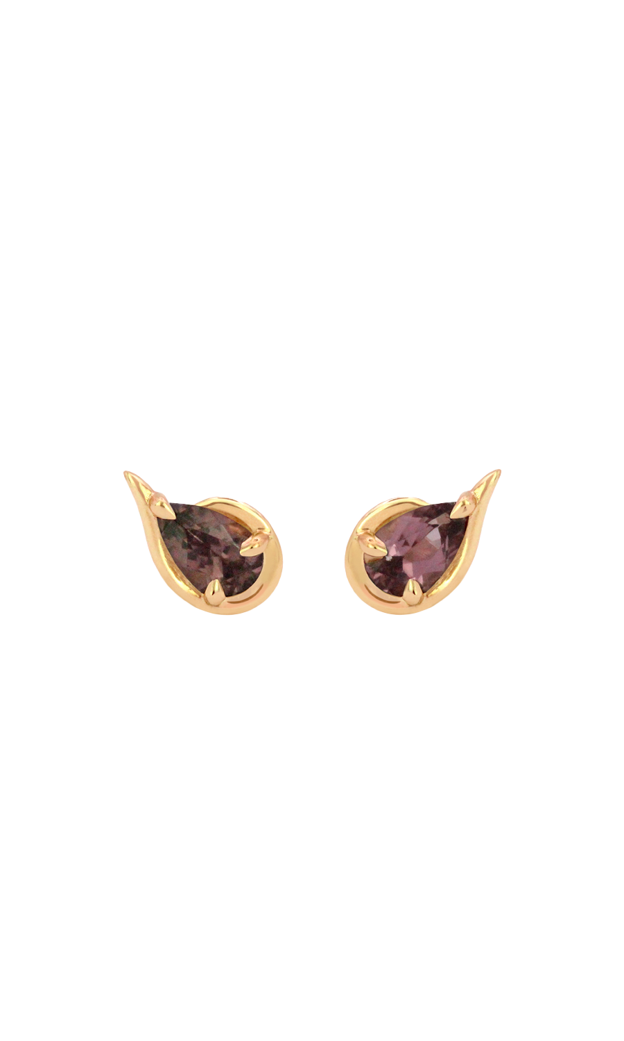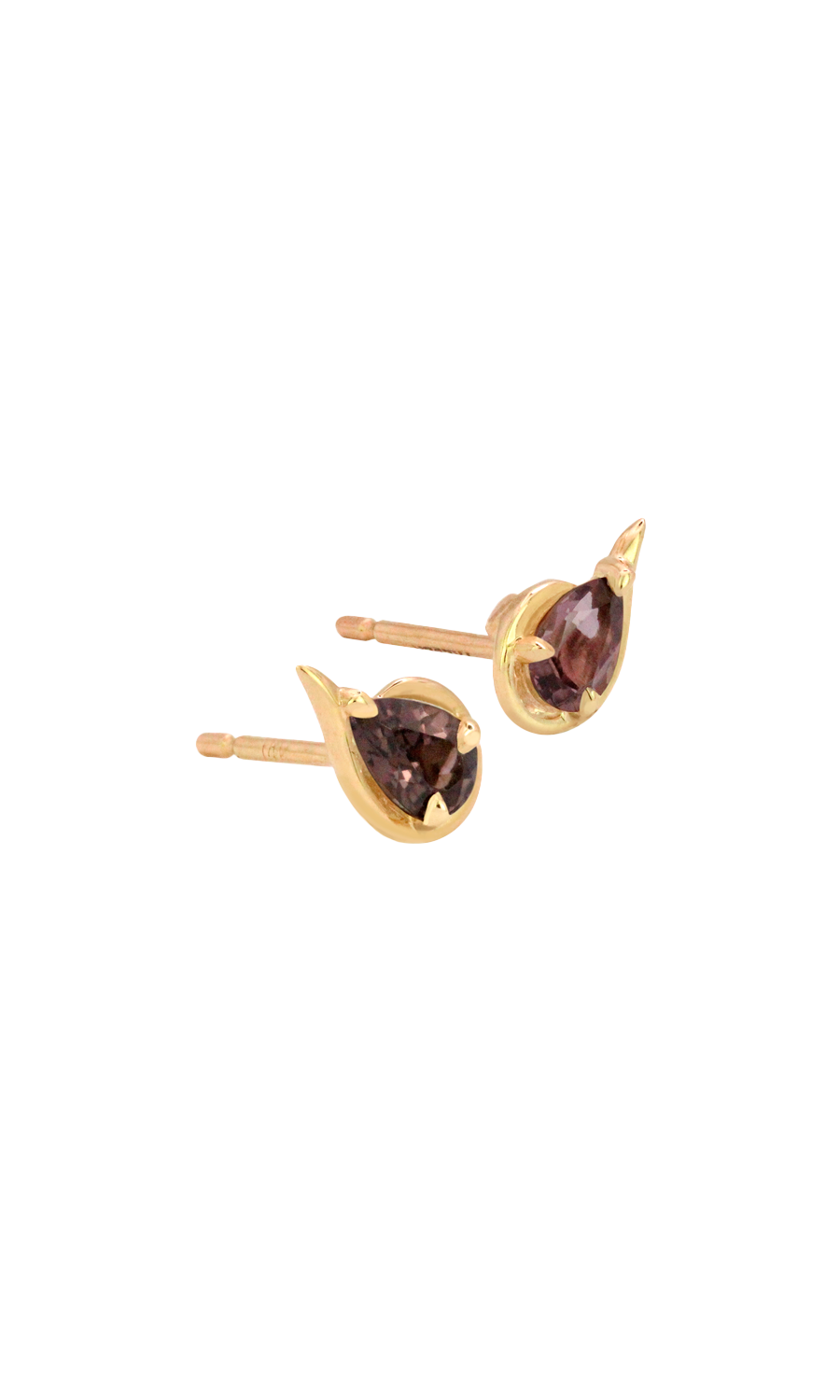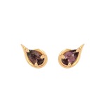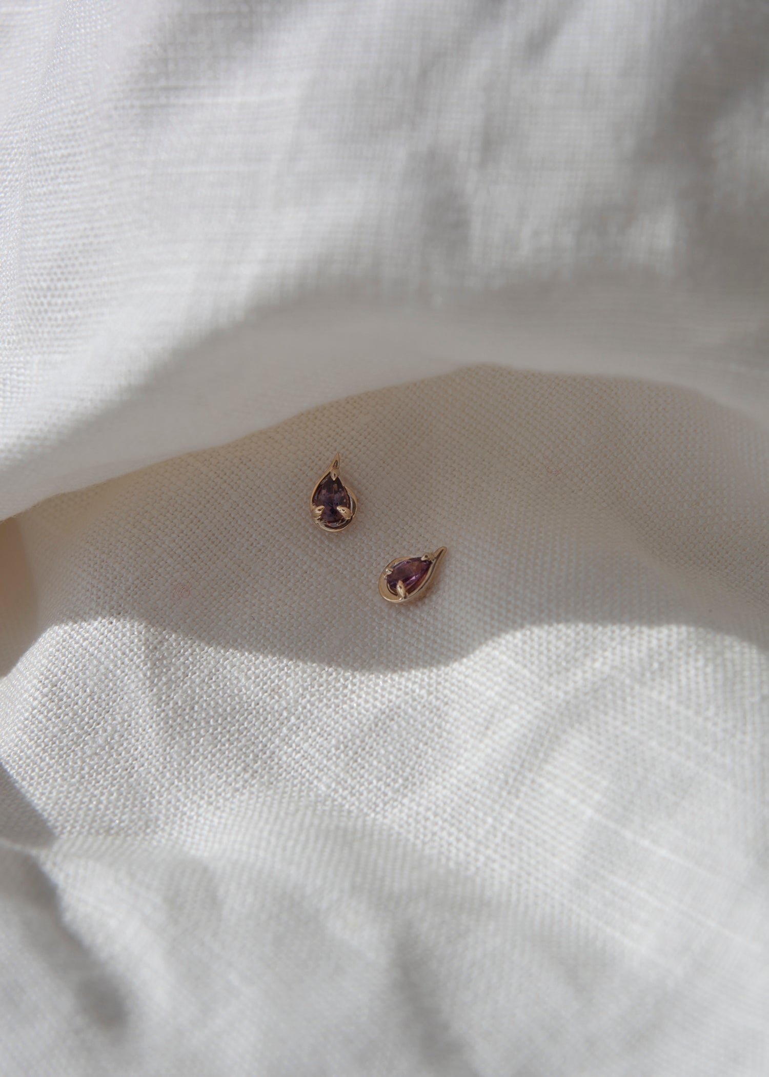 These earrings were designed in Vermont and hand fabricated in NYC. The studs are made from an alloy of recycled gold and feature ethically sourced spinels from Tanzania.