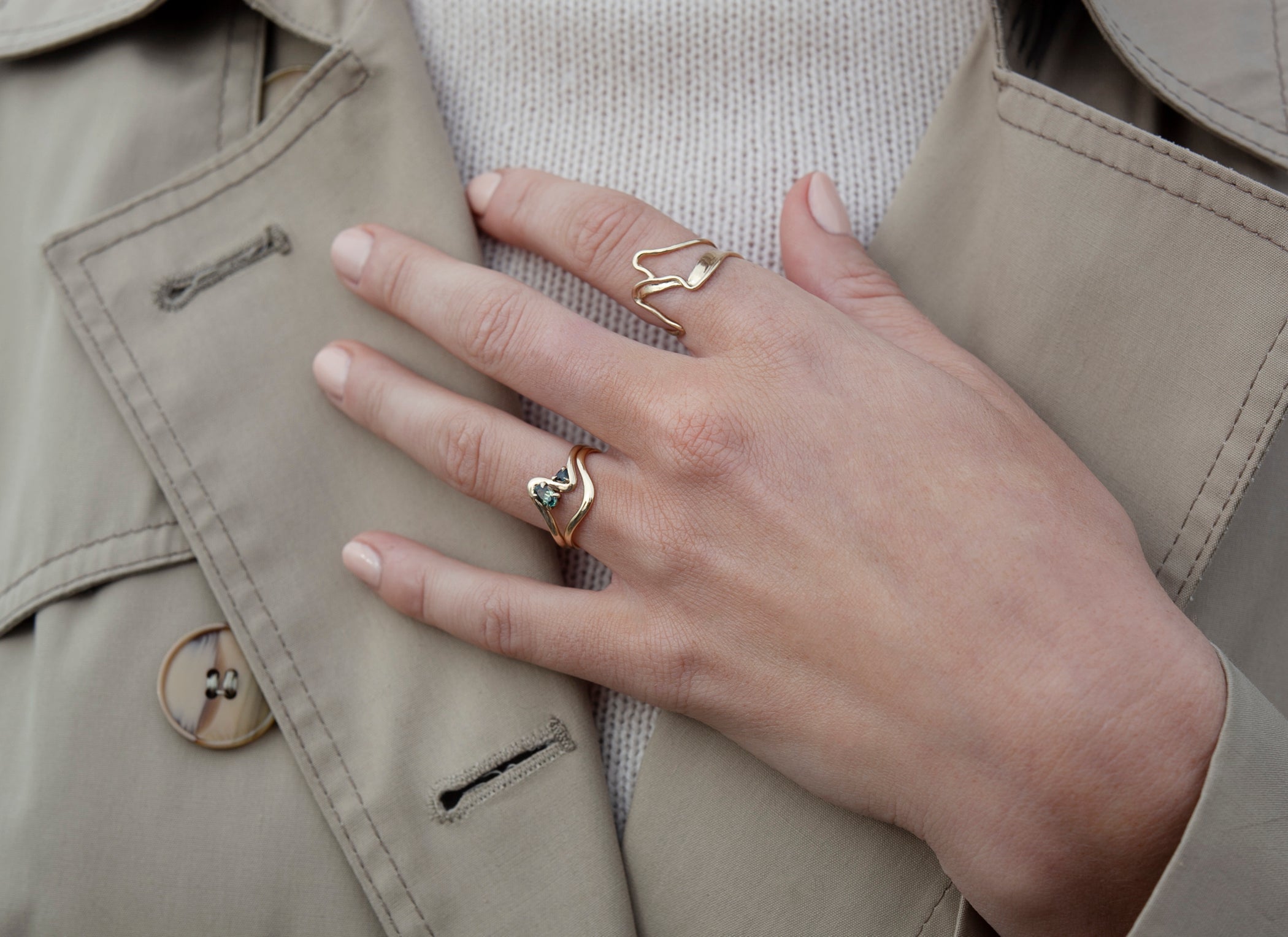 This ring was designed in Vermont and hand fabricated by a 3rd generation family owned workshop in NYC. The ring is made from recycled gold and features two ethically sourced sapphires from Queensland, Australia.