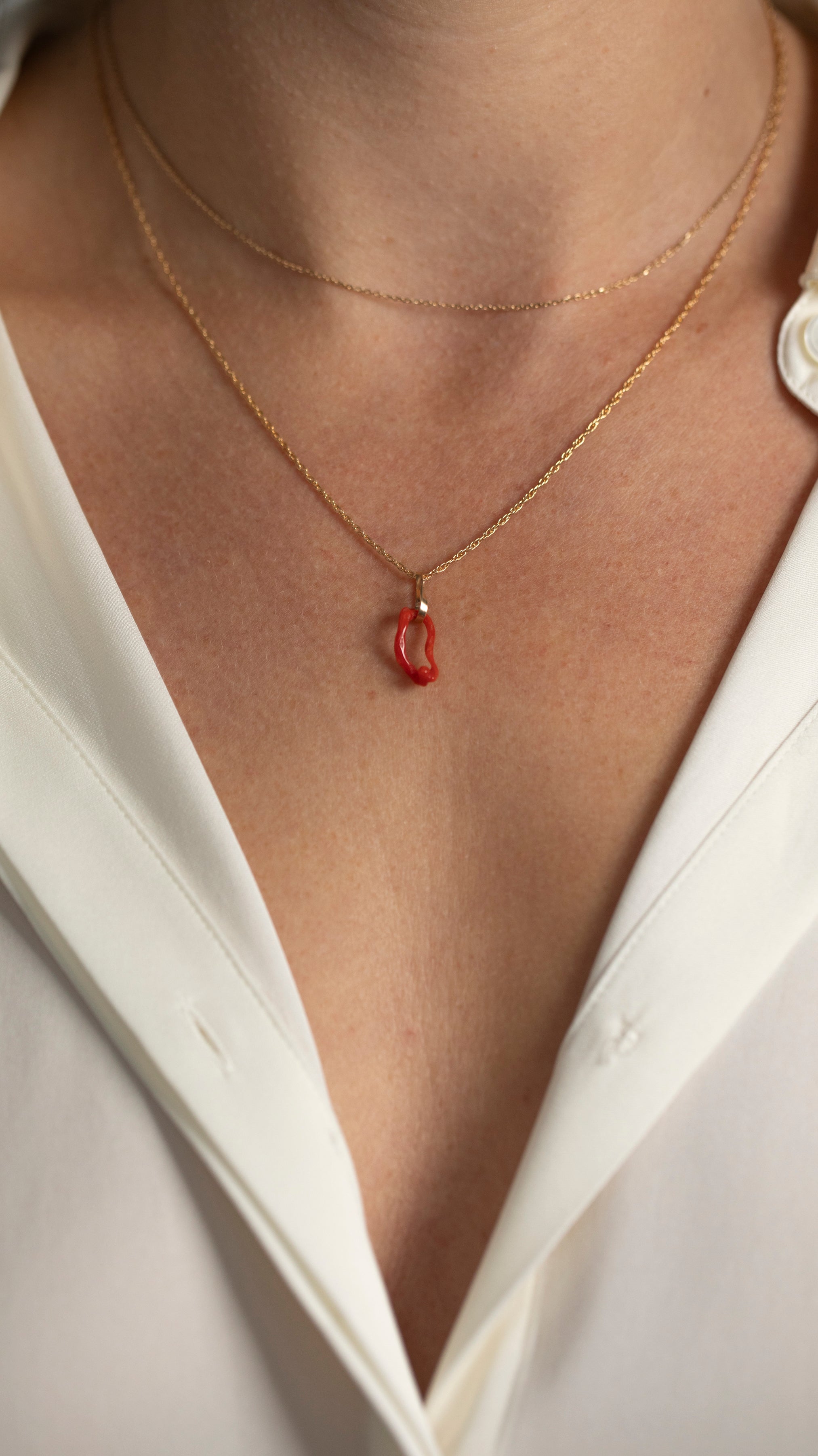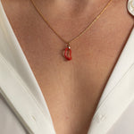 A one of kind piece of coral hands from a 14kt yellow gold bale, on a 18" gold fill chain. Imagined during a spare moment in our studio, this item is part of our sample sale.