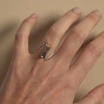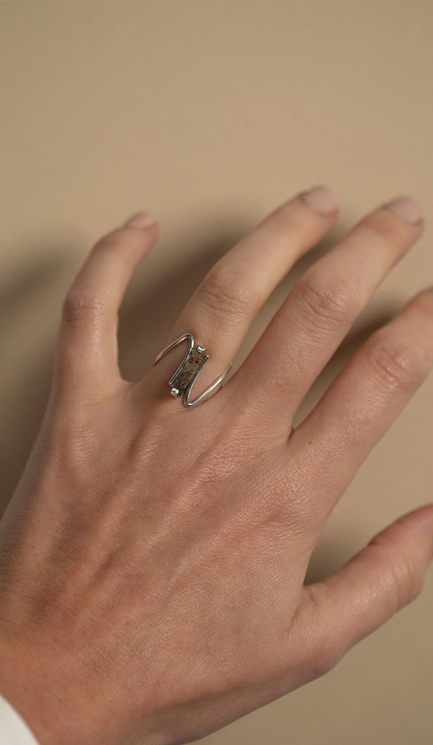 The Elea Ring, was one of the first pieces we ever made for the collection. We have just two, one of kind Eleas left in stock and this is one of them. This ring is set with fossilized dinosaur bone, some dino bones become 'gem quality' when fossilized, making them easy to cut for jewelry. The dino bone in this ring is green, and considered quite rare. The gem was ethically sourced from Wyoming.