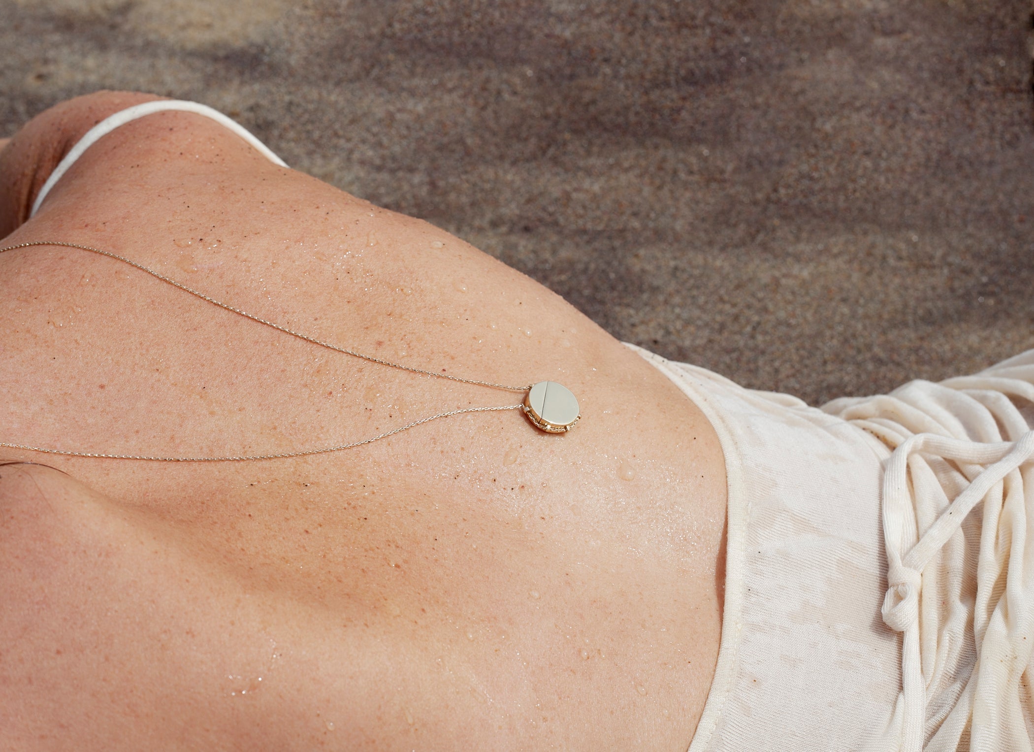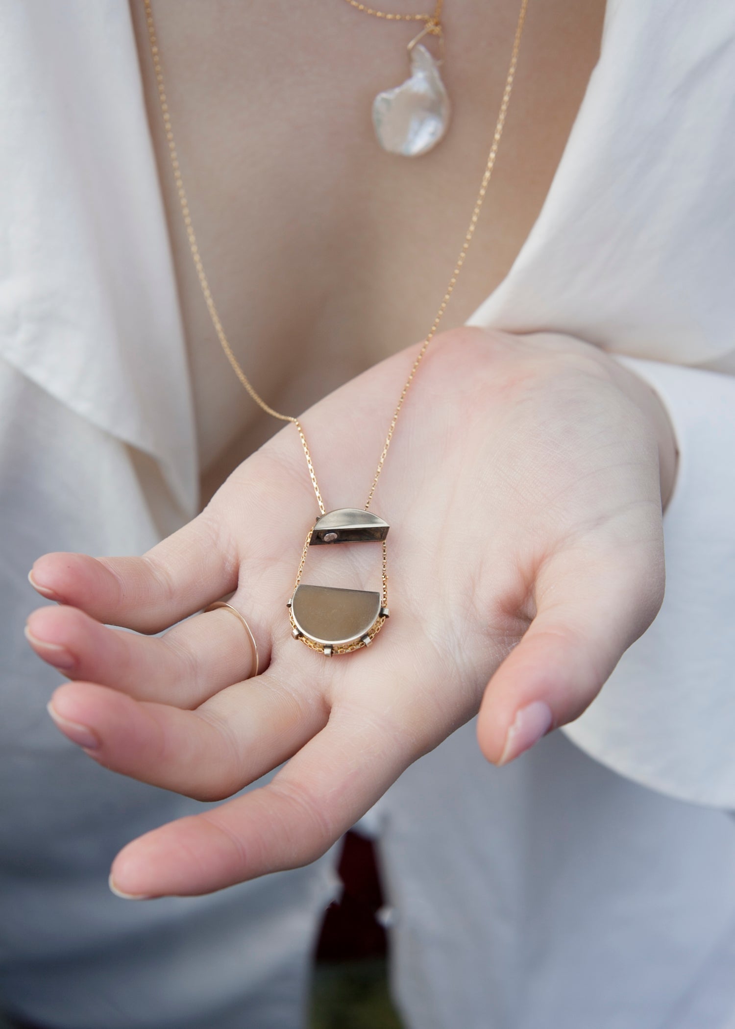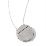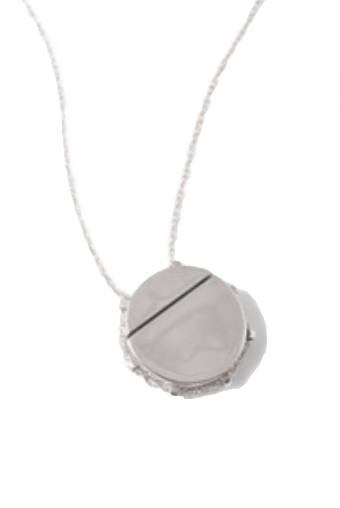 -Locket is hung from 24” fine pulled rolo chain and operates on a sliding mechanism, secured by magnetic lock as shown above.