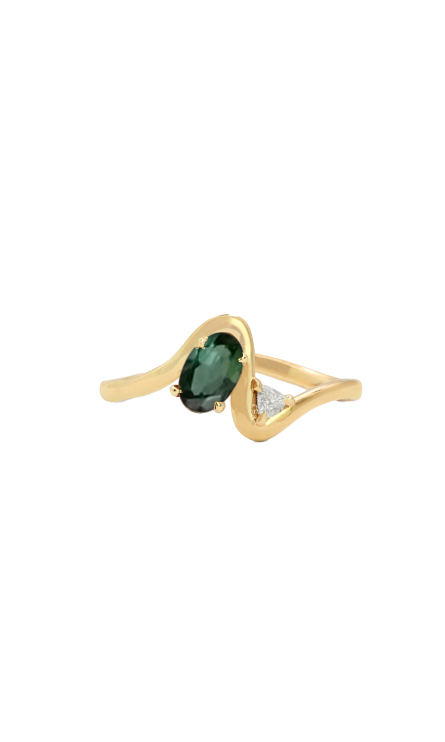 In this contemporary take on the classic Toi et Moi ring a beautiful tourmaline is accompanied by a trillion shaped diamond, set in 14kt yellow gold. Ring is sized to your specifications. We will email you upon order placement to confirm your preferred ring size.