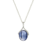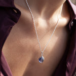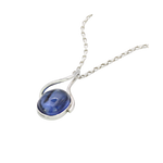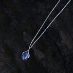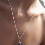 An ethically sourced deep blue sapphire with cats eye line is encased in white gold with a twisted Georgian inspired bale. Wear it as a singular statement or layer with your favorite chains.