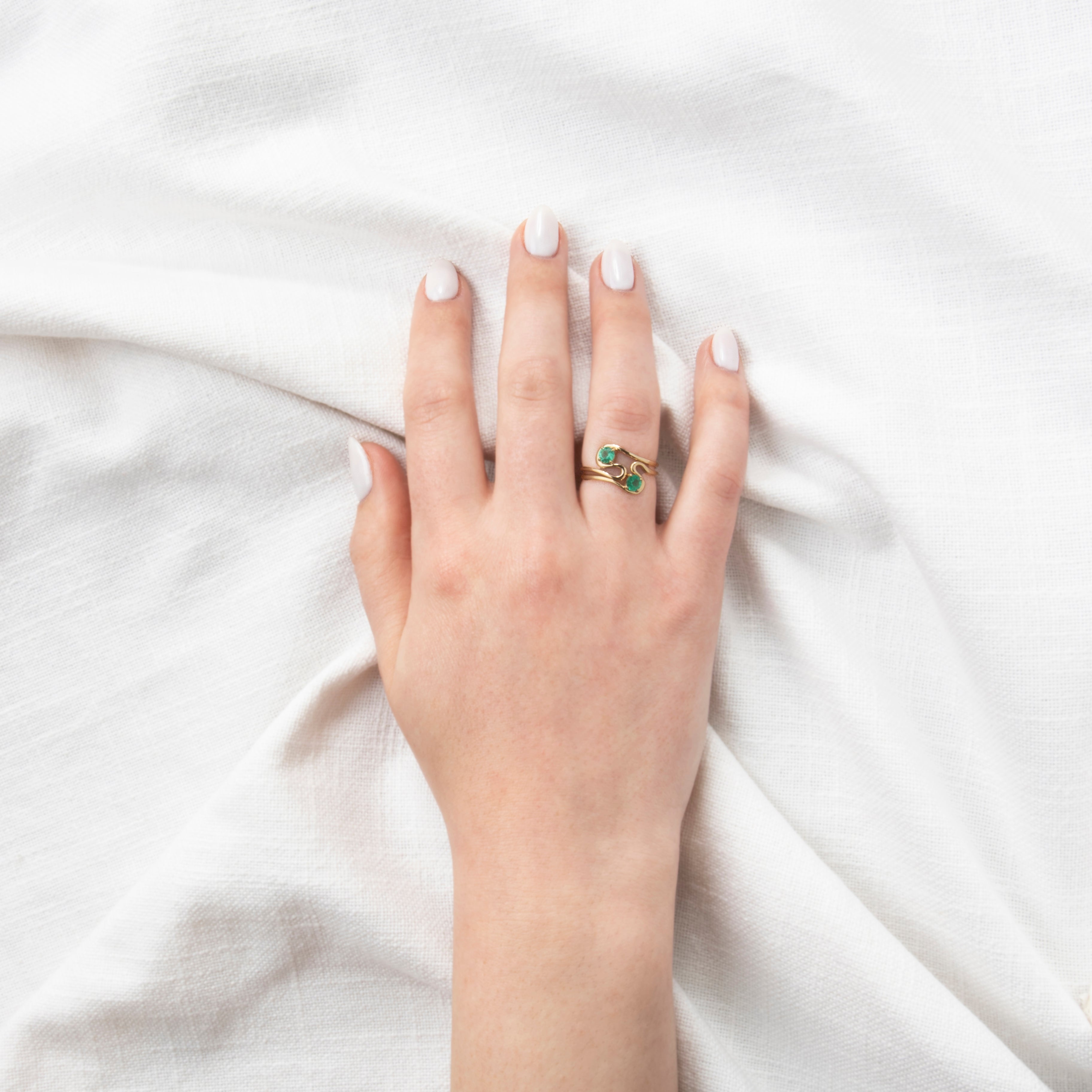 A modern take on the classic Toi et Moi style. Our Twin Flame ring set features two round emeralds, to be worn in union or individually.