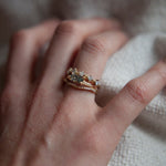 This ring set was hand fabricated in a 3rd generation family owned workshop in NYC, and is made of a recycled gold alloy. The gemstones are sustainably and ethically sourced.
