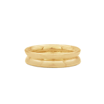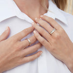 Inspired by vintage motorcycle tires, this unisex band can be a wedding band or an addition to your every day stack. The Ryder Band comes in two sizes, the weighted band is the larger of the two and is shown on the model's right hand . You can find the more subtle Classic Ryder Band Here.