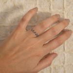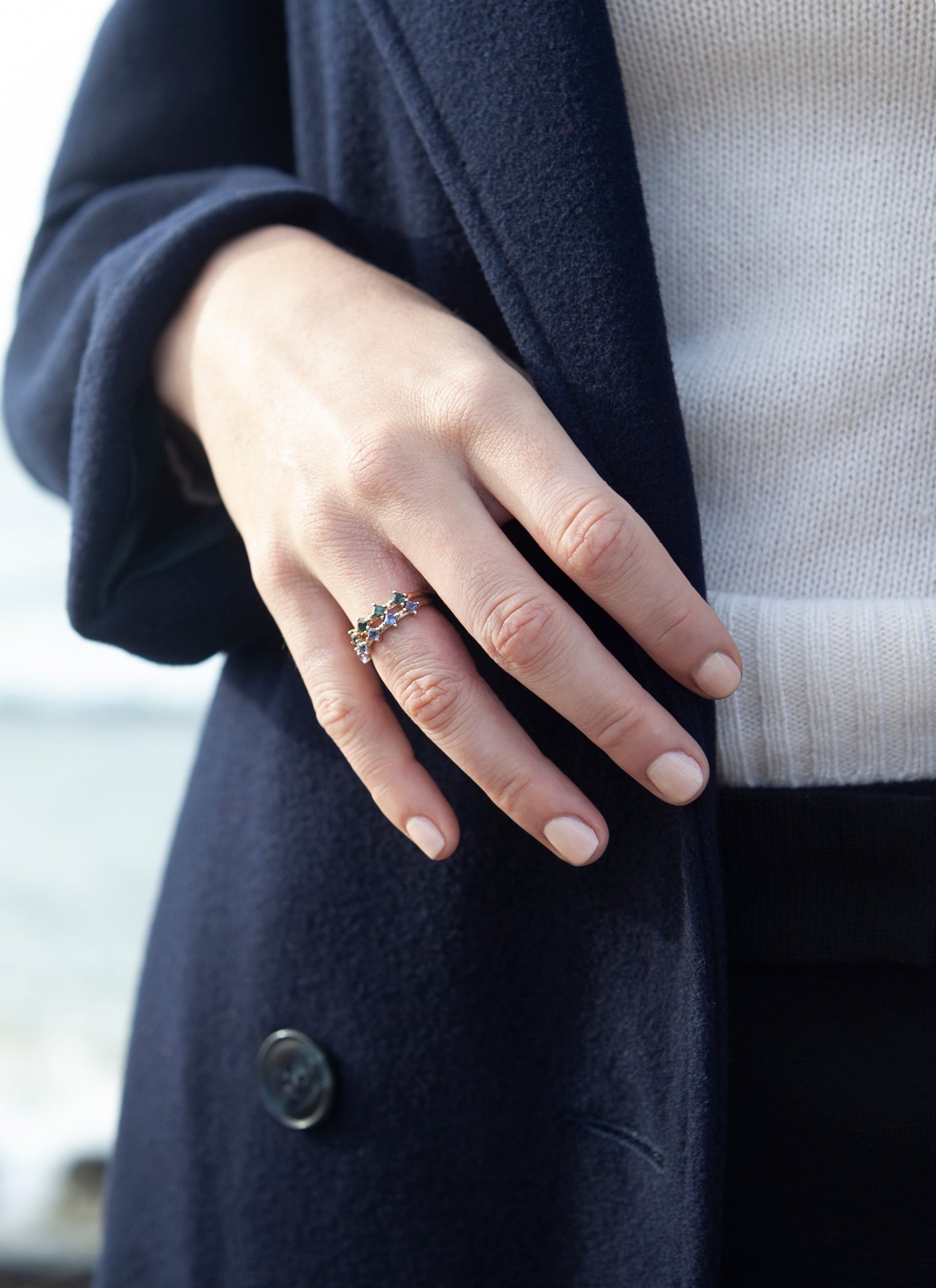A sweet five-stone band, featuring princess cut tanzanites. Intended to be worn as subtle statement or an addition to your stack (and styled with) your daily jewelry repertoire.