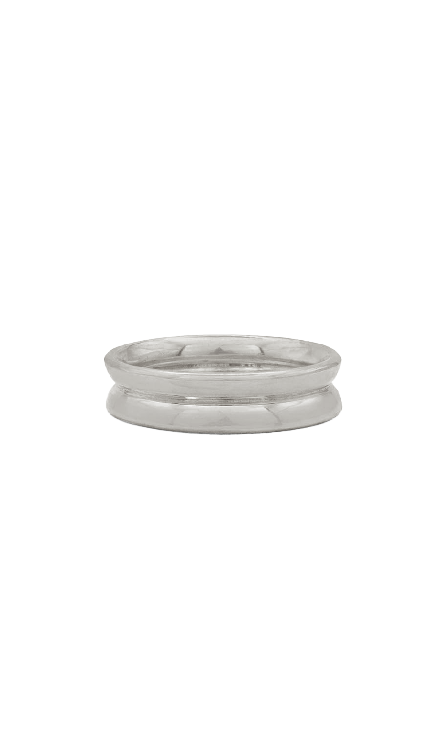 Inspired by vintage motorcycle tires, this unisex band can be a wedding band or an addition to your every day stack. The Ryder Band comes in two sizes, the weighted band is the larger of the two and is shown on the model's right hand . You can find the more subtle Classic Ryder Band Here.
